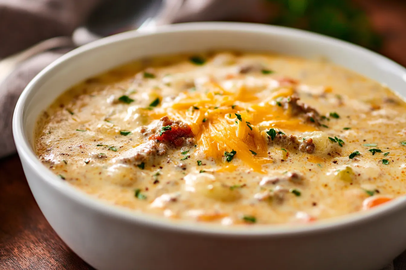 Savor an Easy Hearty Crock Pot Cheeseburger Soup packed with flavors comfort Perfect for busy nights and satisfying for the whole family